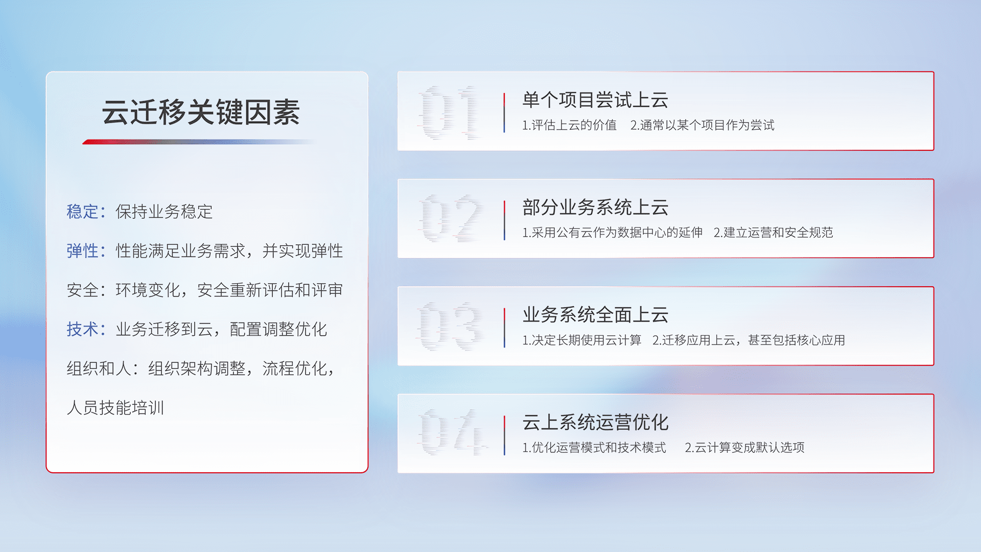 结合实际业务,,从规划设计、、、云平台选型、、云原生改造、、、数据迁移、、、集成交付,,,迁移全过程为客户识别最佳上云路径,,,,做好风险识别管理,,,设计网络架构、、身份权限、、、安全审计合规、、操作审计、、、日志审计、、、监控告警策略、、、多站点容灾设计等,,,,对云上基础设施进行整体规划,,,,提升IT治理水平,,,,以满足弹性、、高可用、、高性能的需求。。